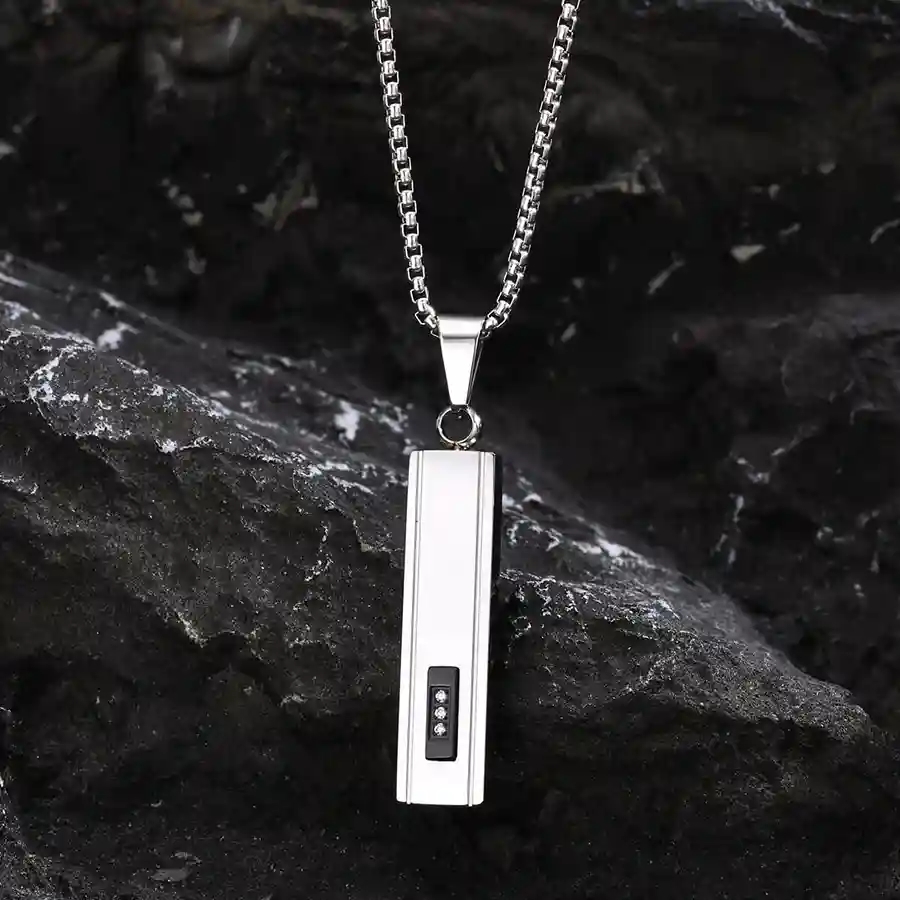Herresmykke i rustfritt stål med rektangulær bar pendant og CZ-detaljerHerresmykke i rustfritt stål med rektangulær bar pendant og CZ-detaljerHerresmykke i rustfritt stål med rektangulær bar pendant og CZ-detaljer