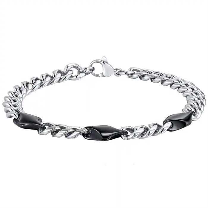 Herrearmbånd som kombinerer et klassisk kjededesign i rustfritt stål med sorte agatdetaljer, som gir armbåndet et røft og moderne uttrykk. Kontrasten mellom det blanke stålet og de sorte, glatte elementene skaper et markant utseende, som passer perfekt til den stilbevisste mannen.