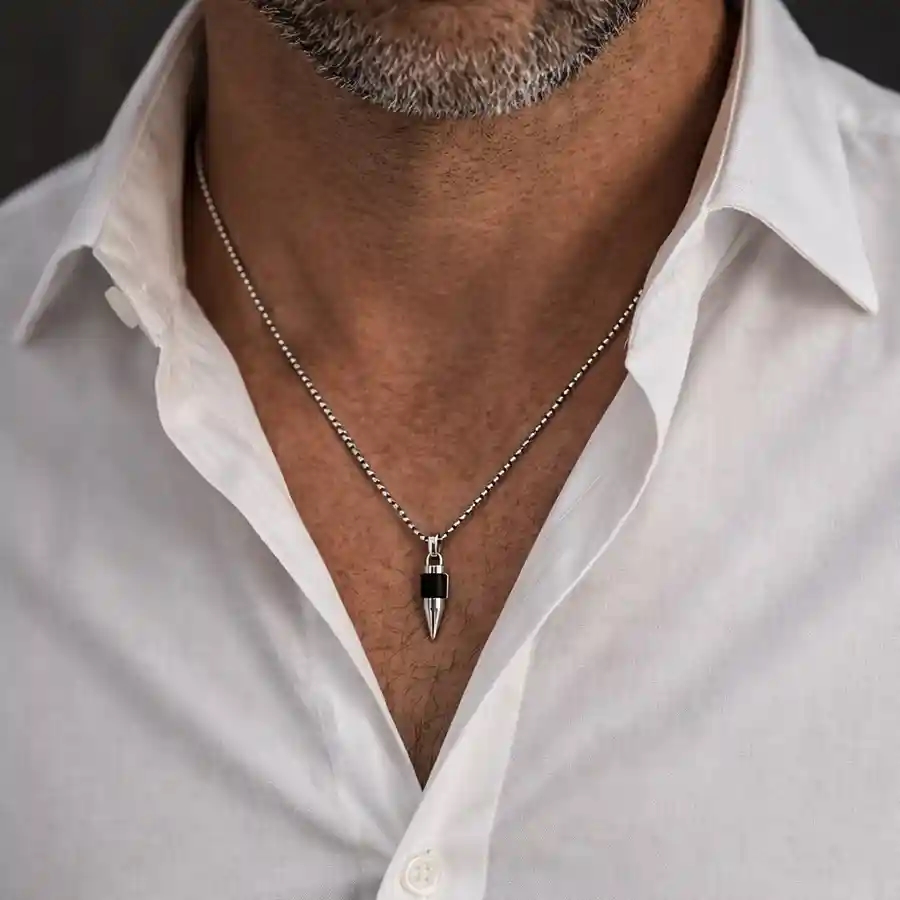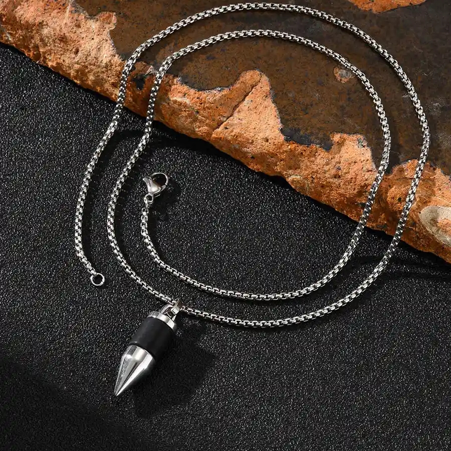 BulletCore Steel Necklace er skapt for mannen som tør å skille seg ut. Anhenget, inspirert av en patron, er laget i rustfritt stål med svart midtseksjon for et røft og maskulint utseende.
