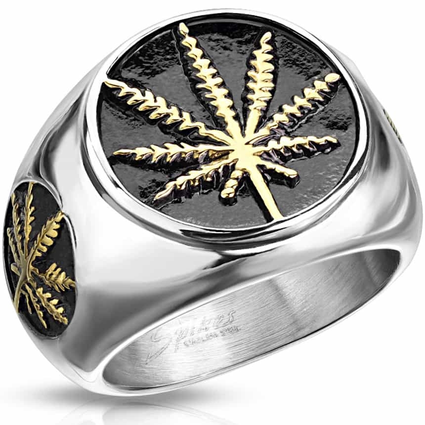 - Med sitt hologram av cannabis og forgylte finish skiller denne herre-ringen seg ut. Laget av rustfritt stål, med en topp på 1,5 x 1,5 cm, er denne ringen både stilfull og holdbar.