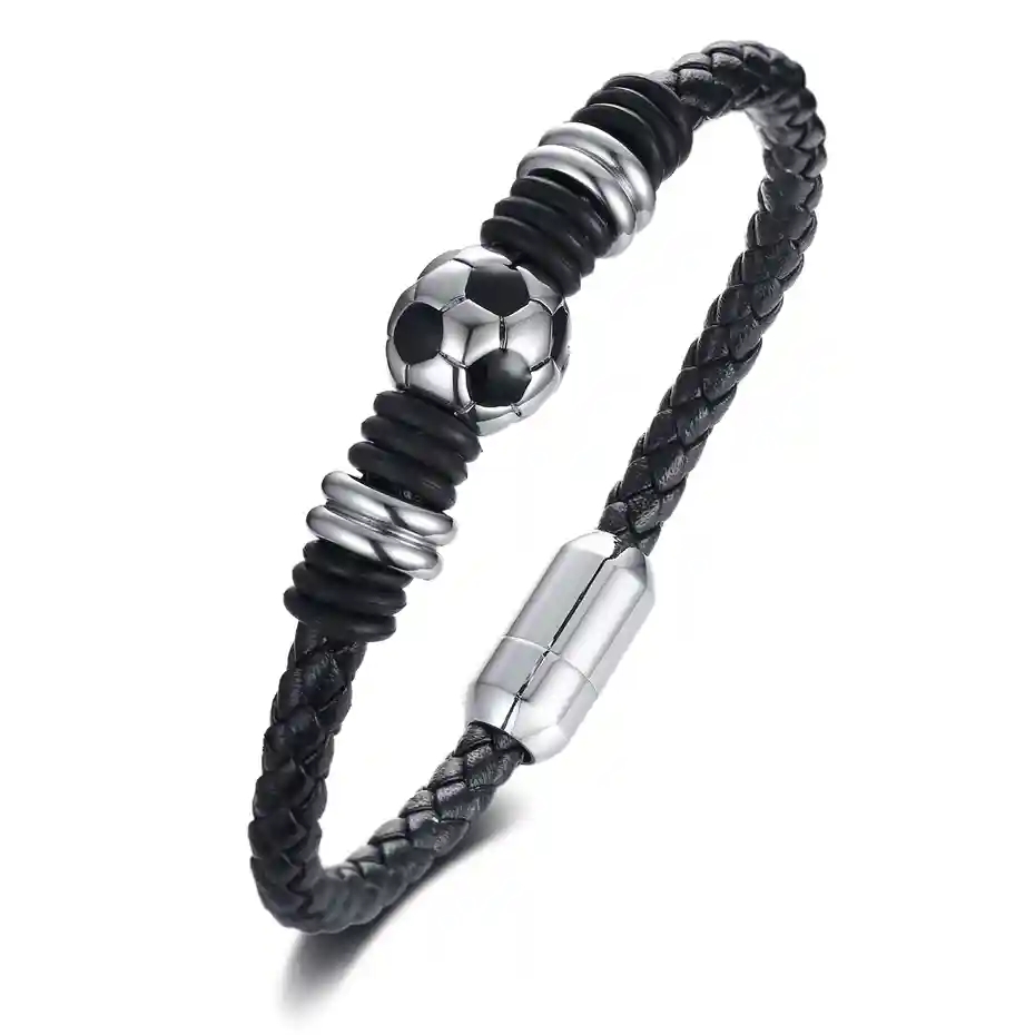 Vis din kjærlighet til spillet med dette maskuline fotballarmbåndet designet for den ekte fotballelsker. Armbåndet kombinerer ekte flettet lær med et høyglanspolert fotballanheng i rustfritt stål, som symboliserer styrke, lagånd og lidenskap. Den sikre magnetlåsen gjør det lett å ta av og på – og holder armbåndet sikkert på plass under enhver kamp.