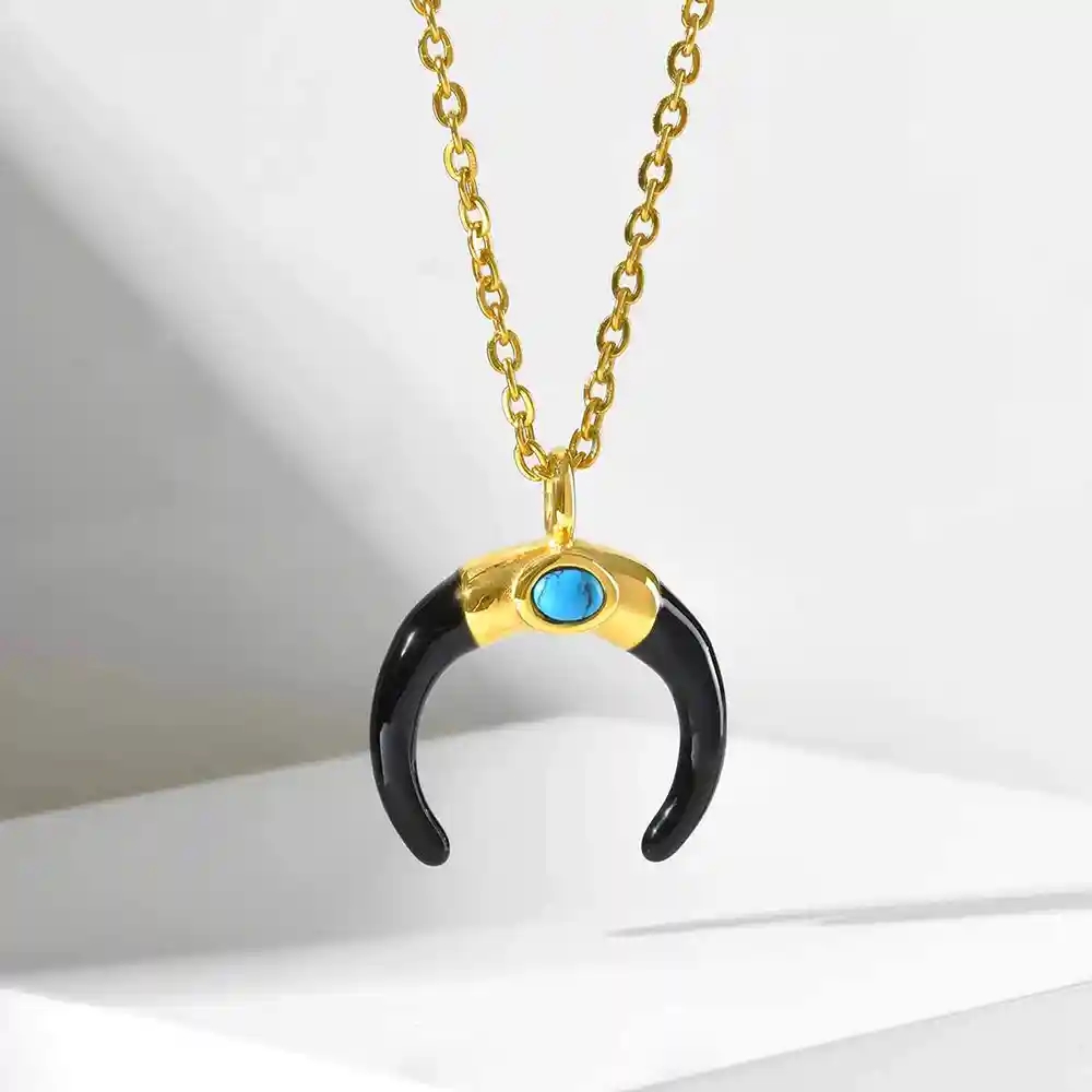 Det forgylte rustfrie stålet fremheves av et svart hornformet anheng og en vakker turkis stein, som gir et rått, men sofistikert uttrykk.