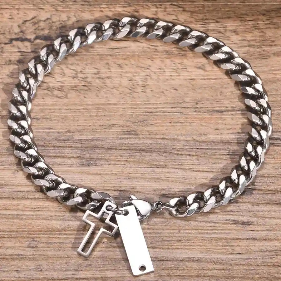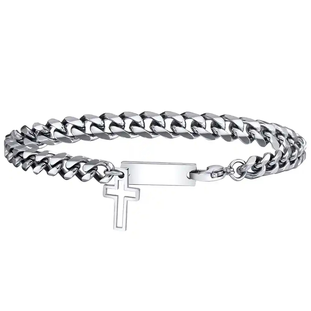 Kraftfullt og stilrent herrearmbånd i rustfritt stål med et klassisk korsvedheng.