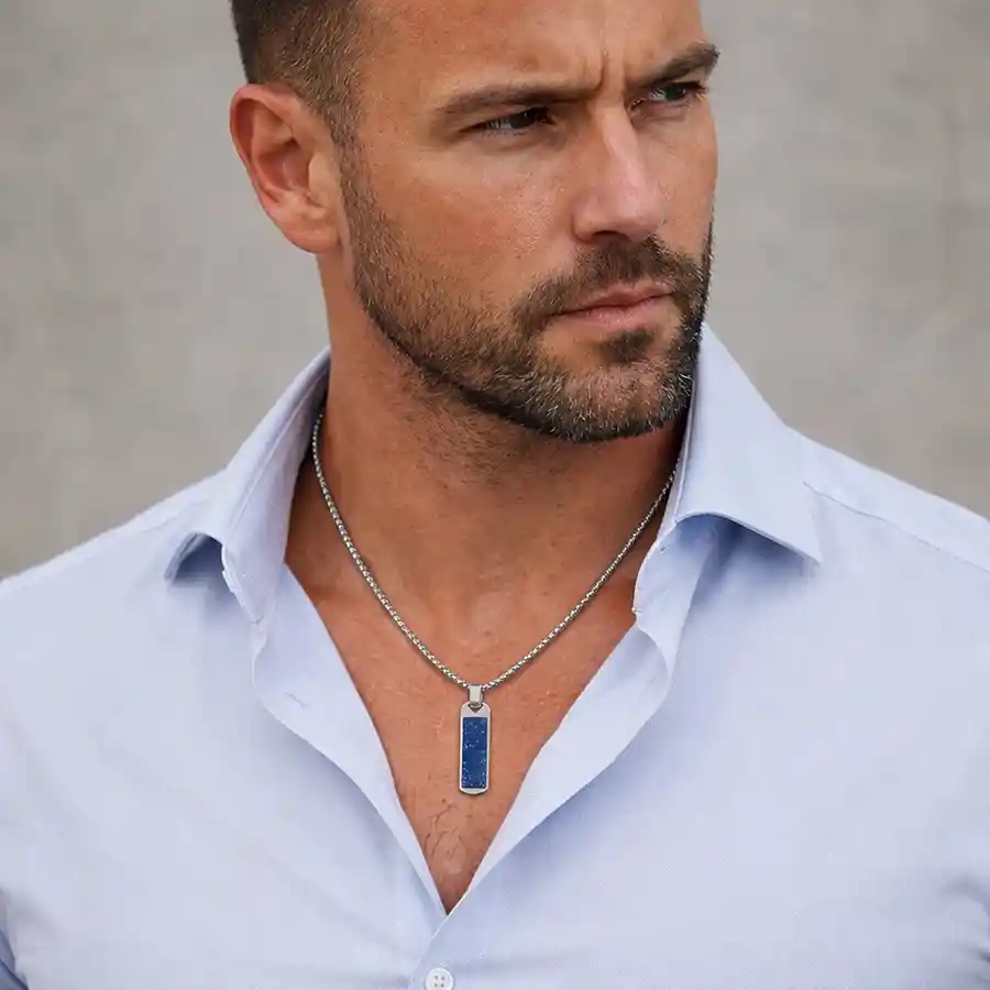 Det er en 60 cm lang kjede og anhenget måler 1,2 x 4 cm.