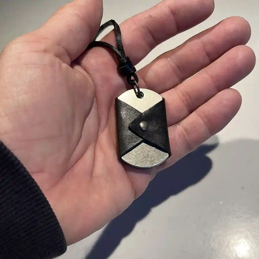 Vedhænget består af kraftigt læderstykke, old metall.