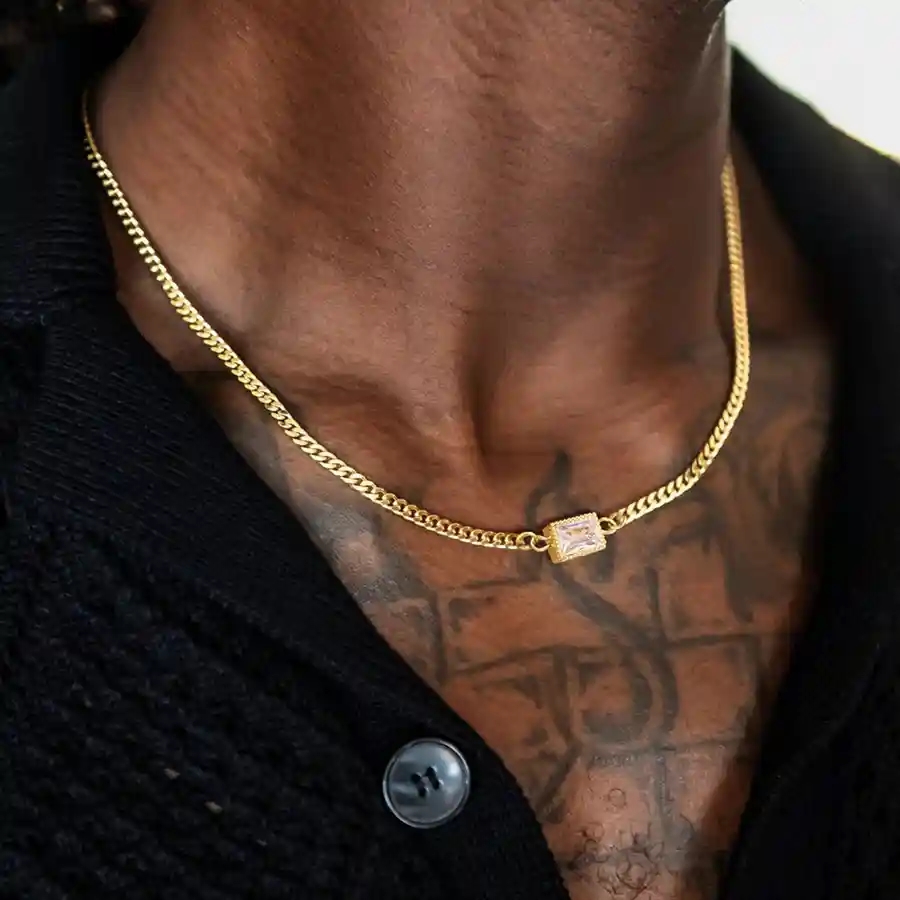 Golden Link CZ halskjede til menn er fremstilt i forgylt rustfritt stål med en elegant firkantet CZ stein som sentrum.