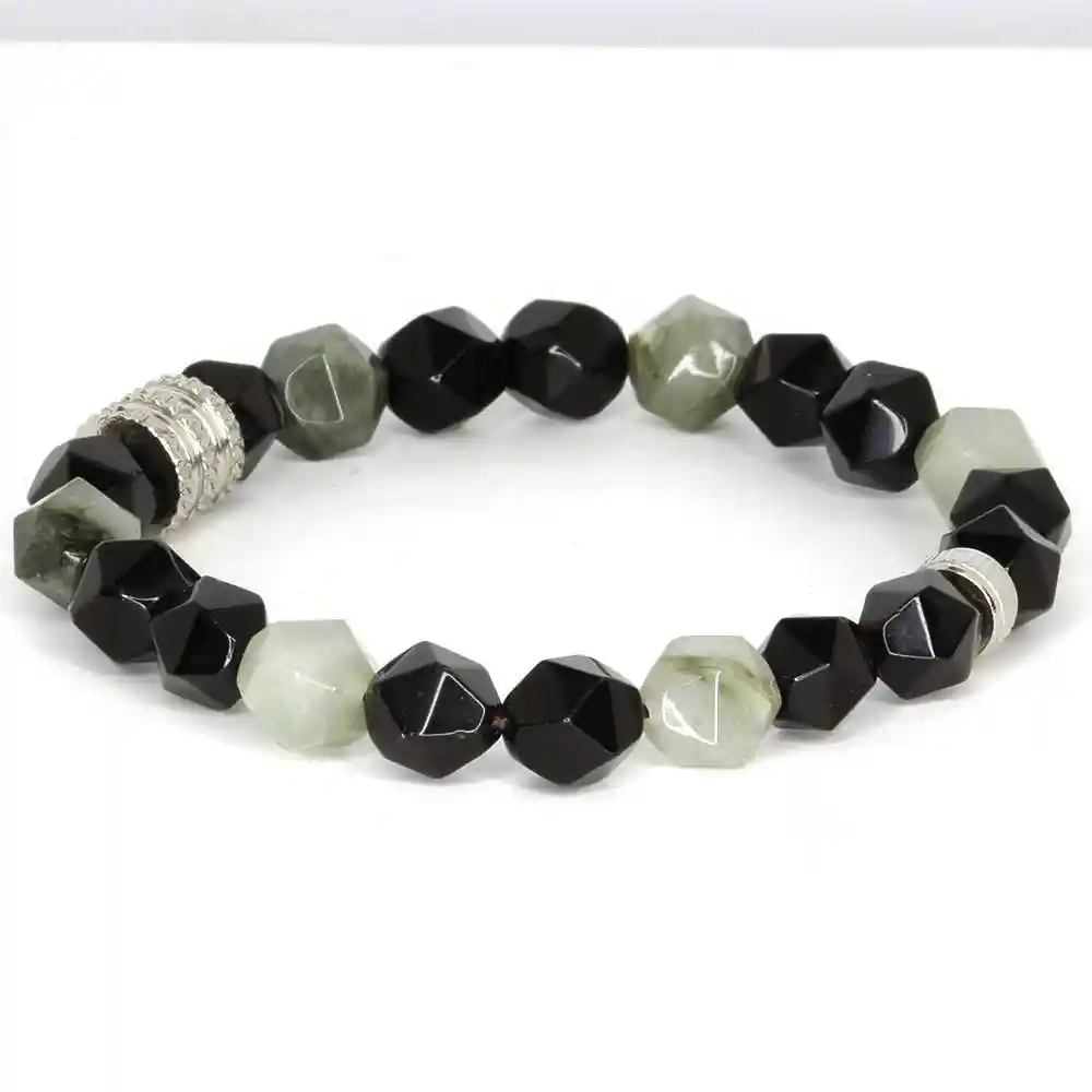 Kombinasjonen av dypsvarte agatperler og 10 mm fasetterte grønne naturstein skaper et unikt samspill mellom styrke og ro.