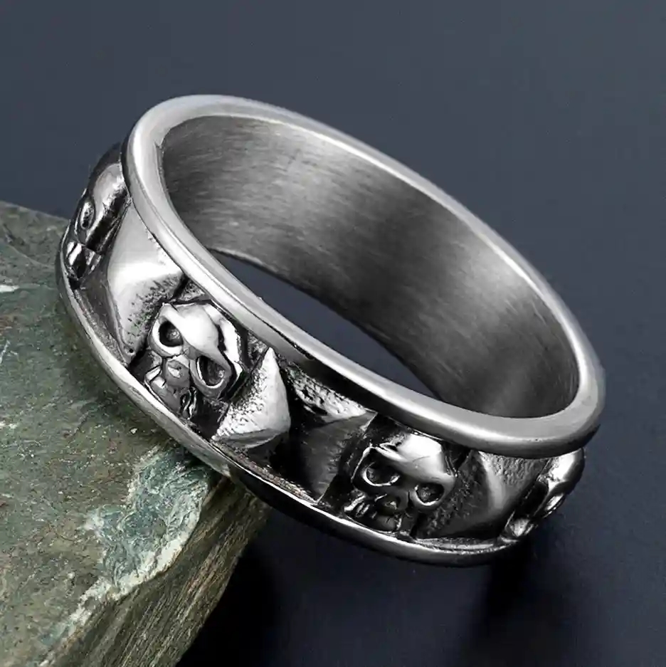 Ringen er med dødningehoder rundt, og ringen er 8mm bred.