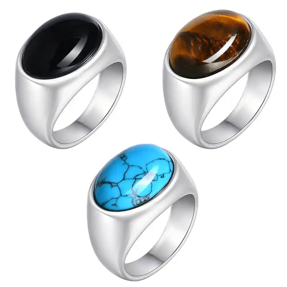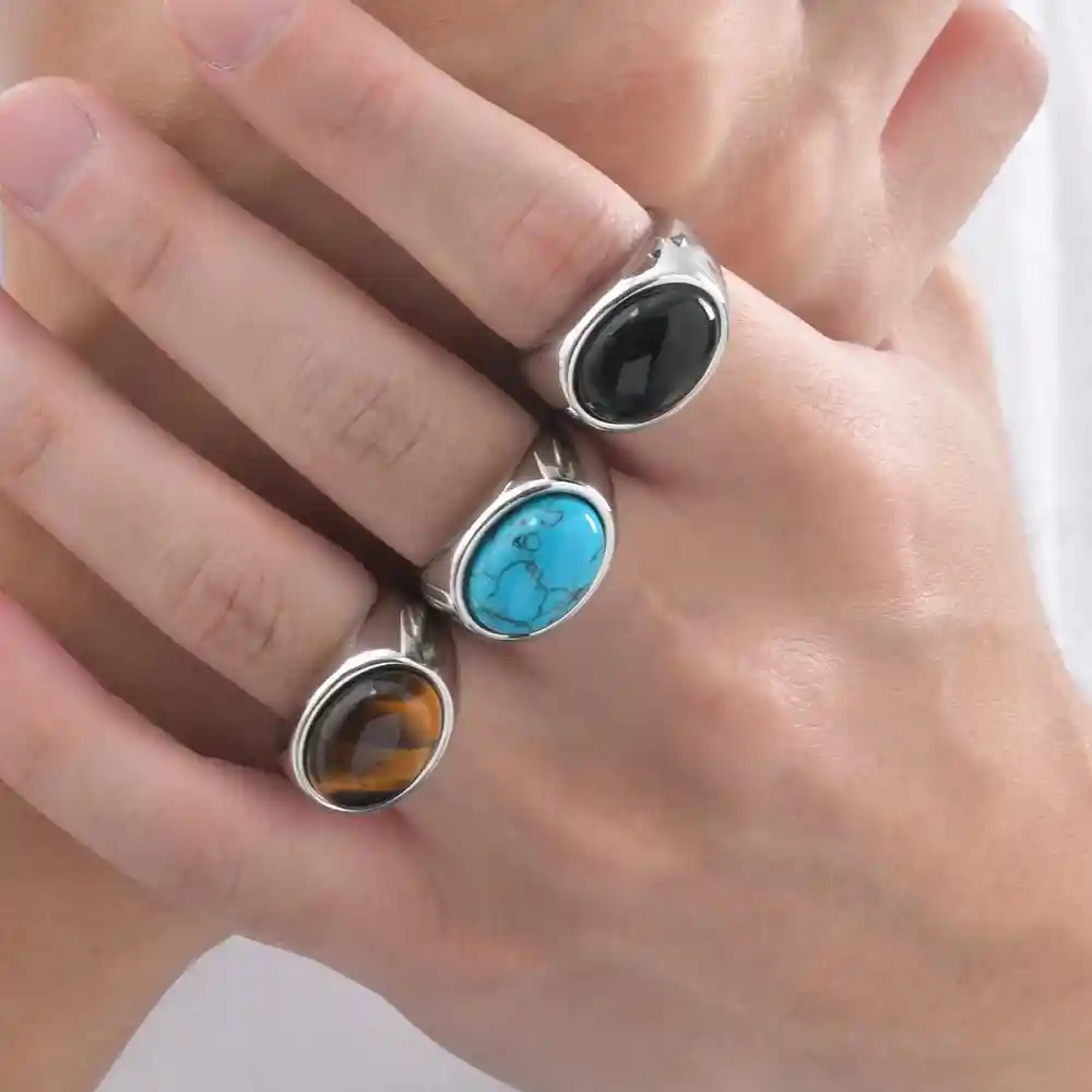 Kraftfull signetring til menn i rustfritt stål med en oval svart stein, som utstråler styrke og tidløs eleganse.