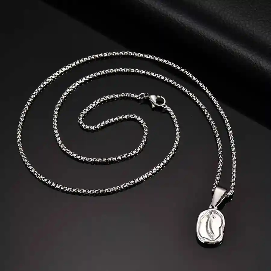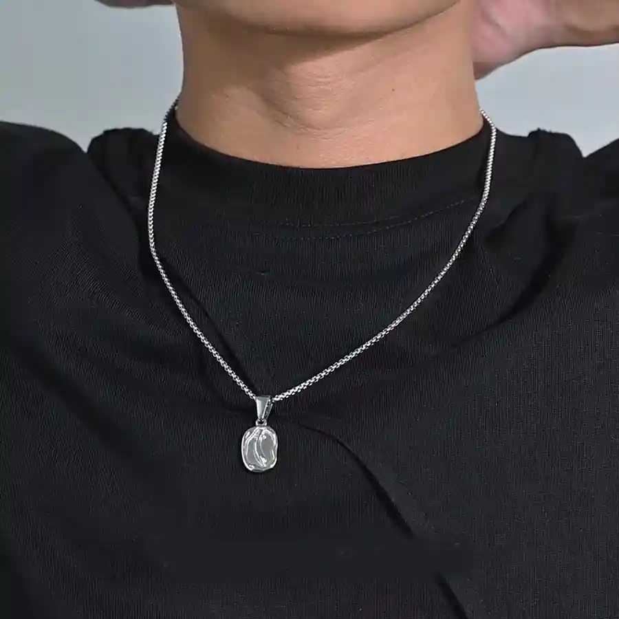 Et stilrent og unikt ovalt smykke til menn i holdbart rustfritt stål. Det organiske designet måler 2.05 × 1.22 cm, og den slanke kjeden leveres i 60 cm lengde. Med sin lettvektskvalitet på kun 4 g er dette et subtilt statement til enhver mann som ønsker et moderne og tidløst utseende.