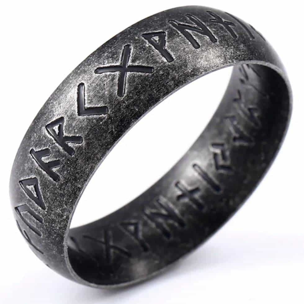 Ringen er laget av oksidert stål og har autentiske runer fra vikingtiden inngravert på den.