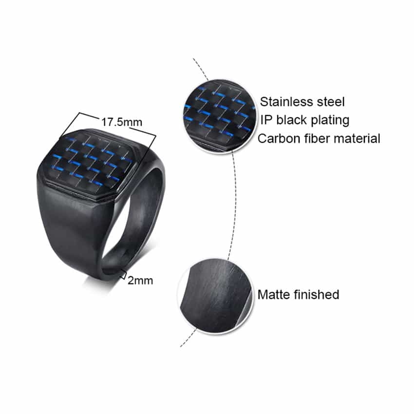 Ringen kombinerer svart mattert rustfritt stål med iøynefallende blå carbon fiber, noe som gir et dristig og maskulint uttrykk.