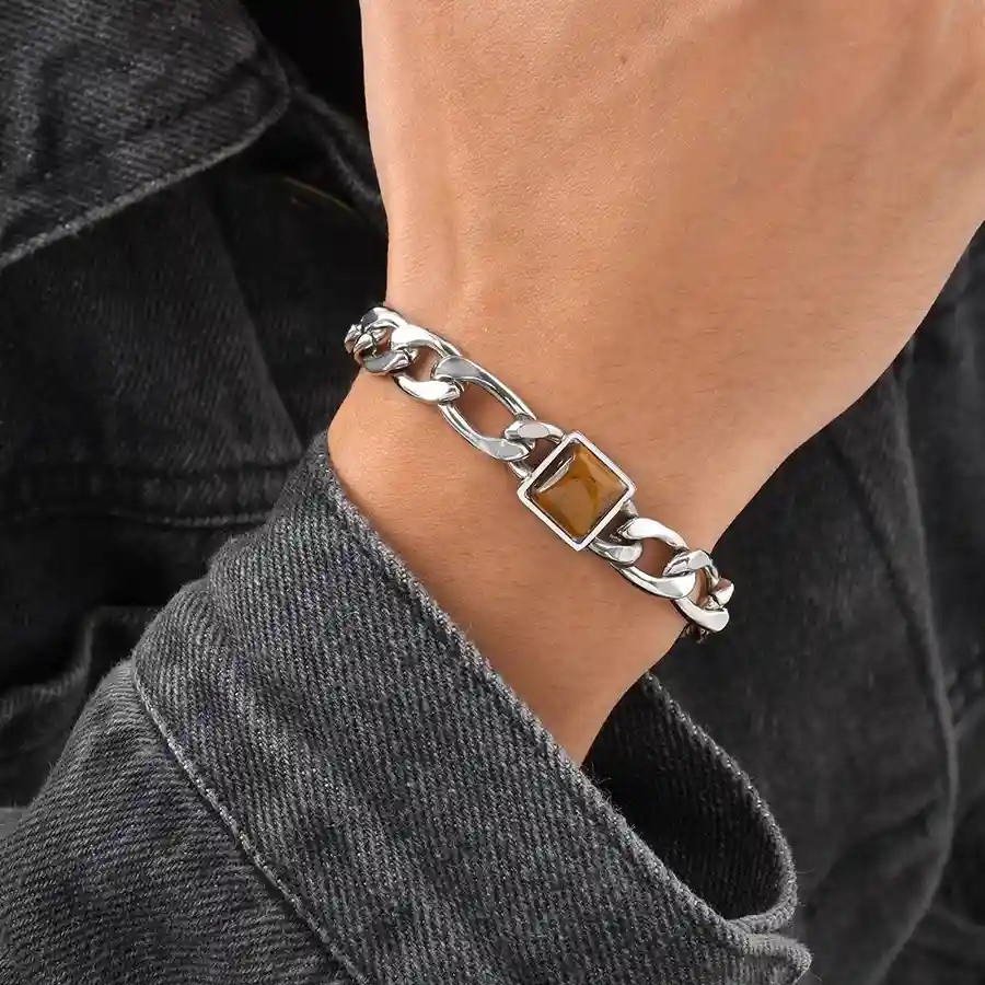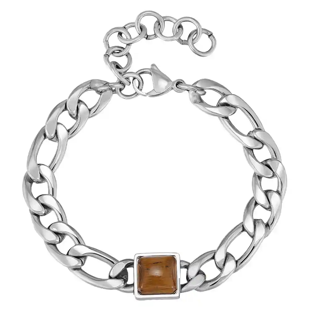 Dette stilrene herrearmbåndet kombinerer et klassisk kjededesign i rustfritt stål med en markant firkantet Tiger Eye-stein i midten. Den varme brune steinen skaper en flott kontrast til det blanke stålet og gir armbåndet et eksklusivt og maskulint uttrykk.