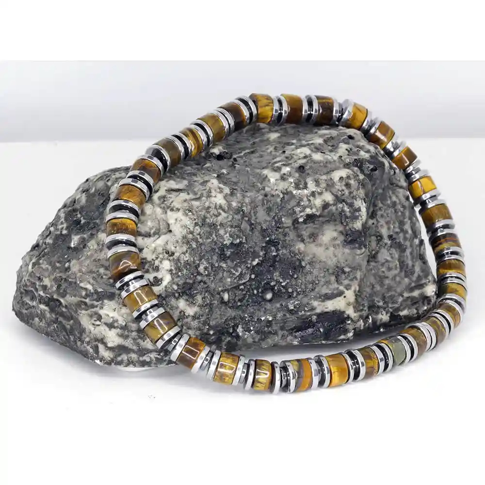 Maskulint armbånd med 8mm perler i kombinasjon av blank hematitt og gyldne Tiger Eye steiner.