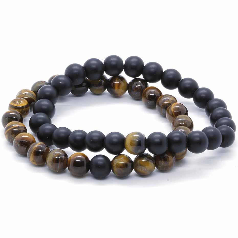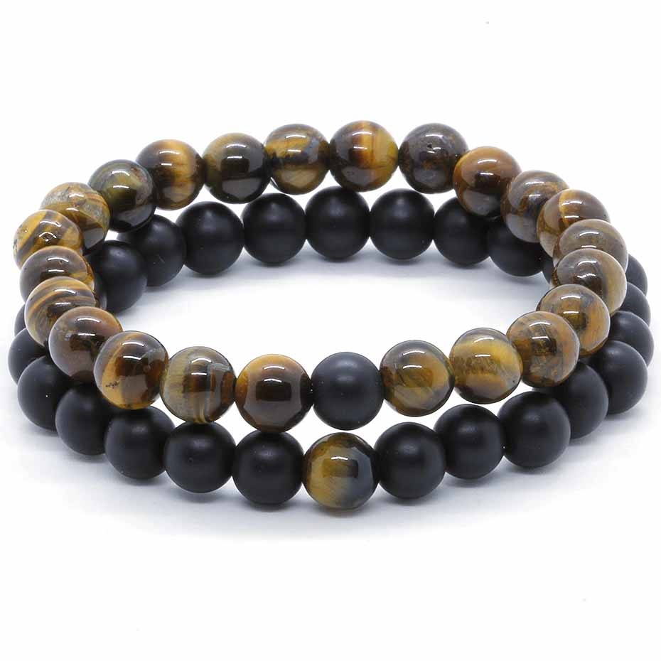 Legg til maskulin energi med dette doble herrearmbåndet i 8 mm onyx- og tigerøyeperler. Matt svart møter varm brun glød i et sett som både kan bæres sammen og hver for seg. Et tidløst tilbehør for ham som ønsker et rått, stilrent og kraftfullt uttrykk.